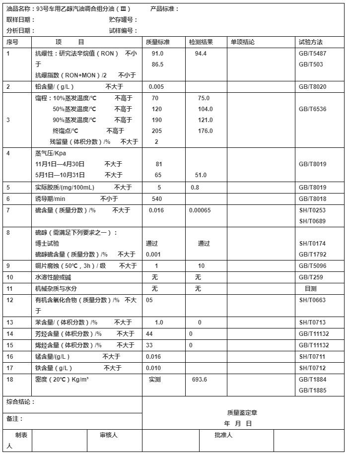 注:1)將試樣注入100mL 玻璃量筒中觀察,應當透明,沒有懸浮和沉降的機械雜質(zhì)及水分。在有異議是,以GB/T511和GB/T260方法測定結果為準。